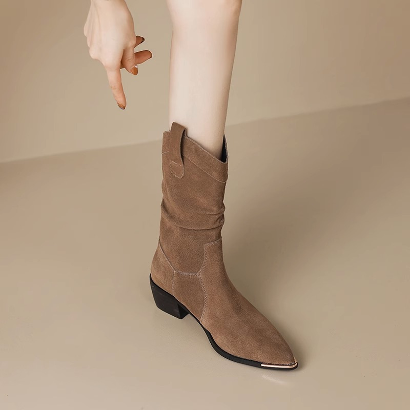 Frosted soft leather pile boots for women’s autumn and winter pointed toe knight boots thick heel retro western denim boots