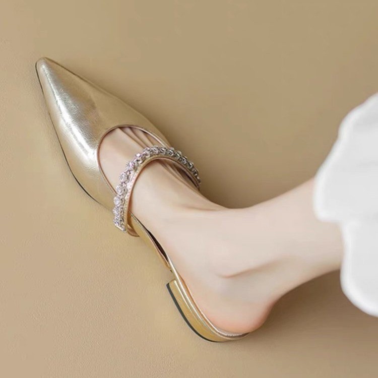 French small fragrant style pointed toe low heel Mueller Baotou semi-drag women wear single-strap silver flat sandals with rhinestones