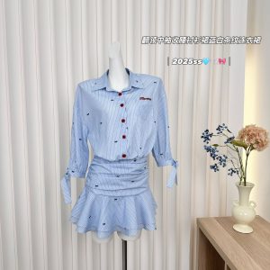 Lapel mid-sleeved waist-hugging shirt skirt blue and white striped dress ruffled pleated skirt