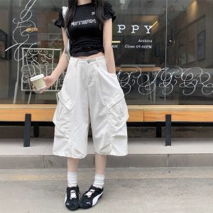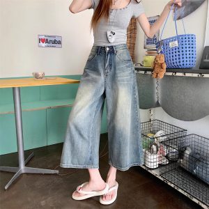 Real shot~Retro hot girl cropped pants denim shorts women’s high waist loose design wide-leg mid-length pants