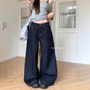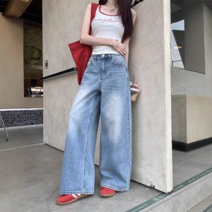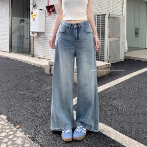 Real-life photo of loose and slimming water washing blue-padded floor jeans for women casual and versatile wide-leg pants