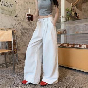 Real-life American white jeans for women in summer high waist loose drooping wide-leg floor trousers