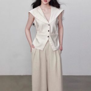 Yuzhi high-quality sleeveless top summer lace-up waist-hugging design temperament beige-white shirt for women