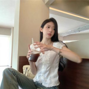 Real photo of summer off-white shirt for women puff sleeve collar one shoulder lace waist-hugging shirt short top