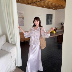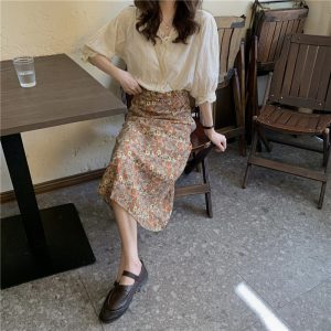 Real photo of summer neck loose retro lace shirt top + high waist slim floral skirt
