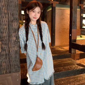 Real shot ~ Japanese loose plaid retro fungus lace shirt women’s casual and fashionable mid-length top
