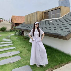 Real shot of polka dot stripes high waist slim design shirt purple shirt skirt suit women