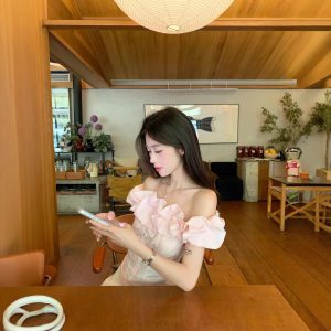 Real shot French sweet one-shoulder shirt for women with waist-hugging slim design short temperament off-shoulder top