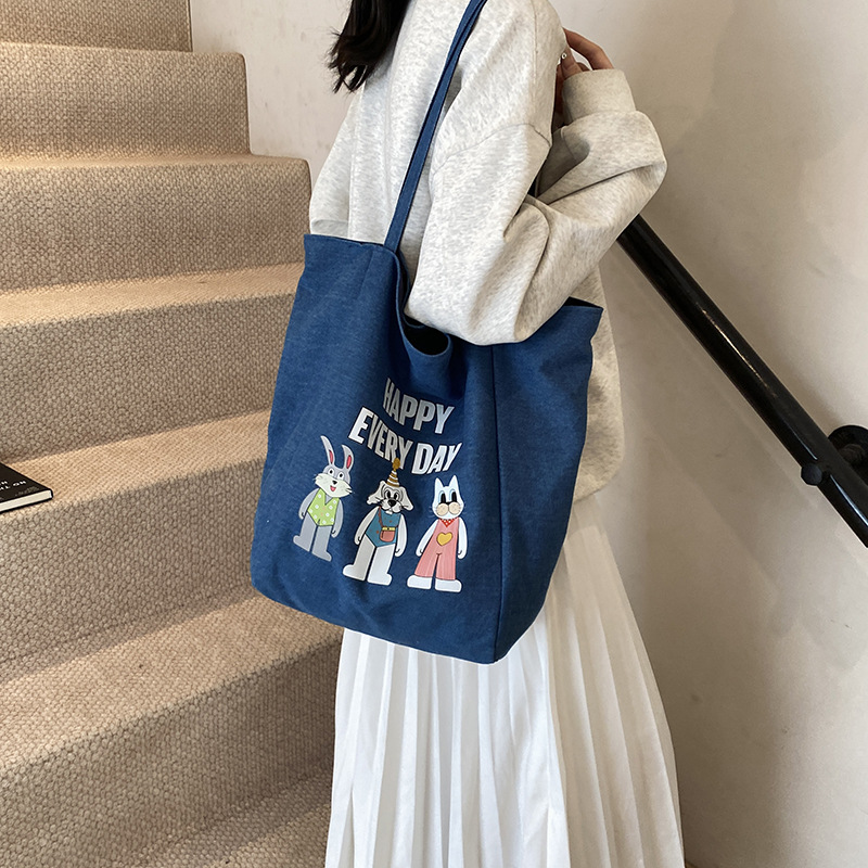 Canvas bag style versatile shoulder bag large capacity cartoon denim double-sided canvas commuting tote bag