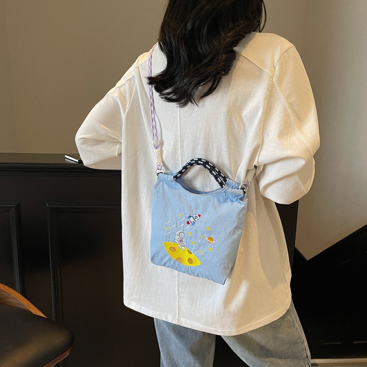 Cute cartoon large capacity shoulder bag embroidered nylon tote shopping bag commuter crossbody bag handbag