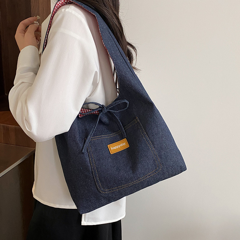 Casual commuting large bag for women double-sided denim single-shoulder underarm tote bag large capacity plaid bag