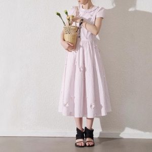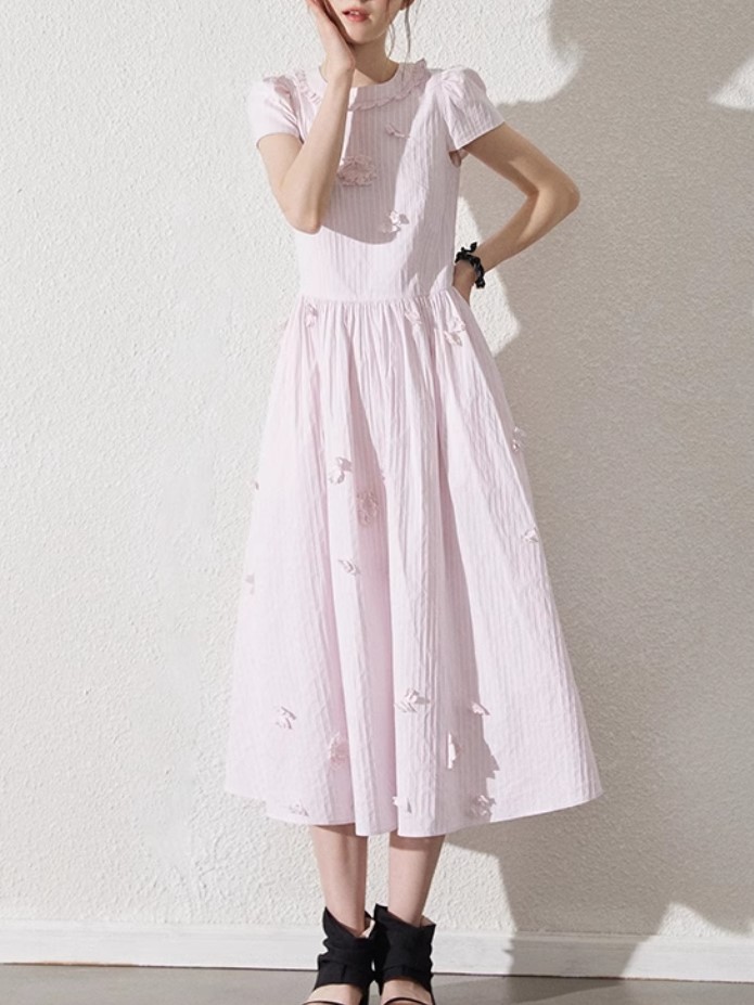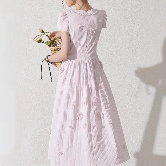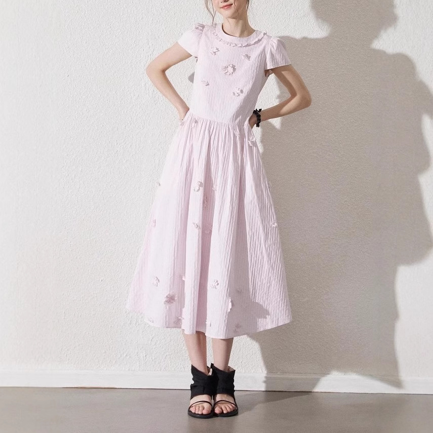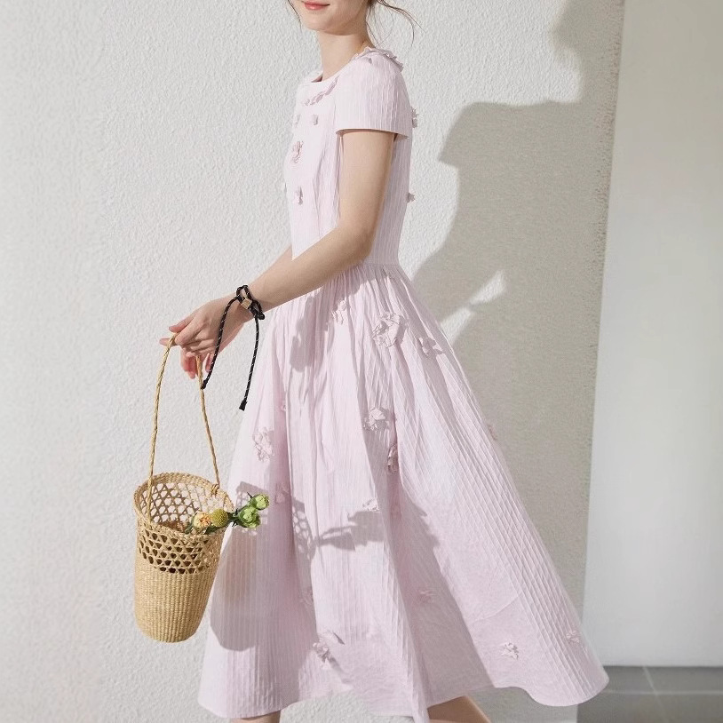 “Chat Yu Shan Cherry” age-reducing three-dimensional flower round neck black ears with micro-puff sleeve dress
