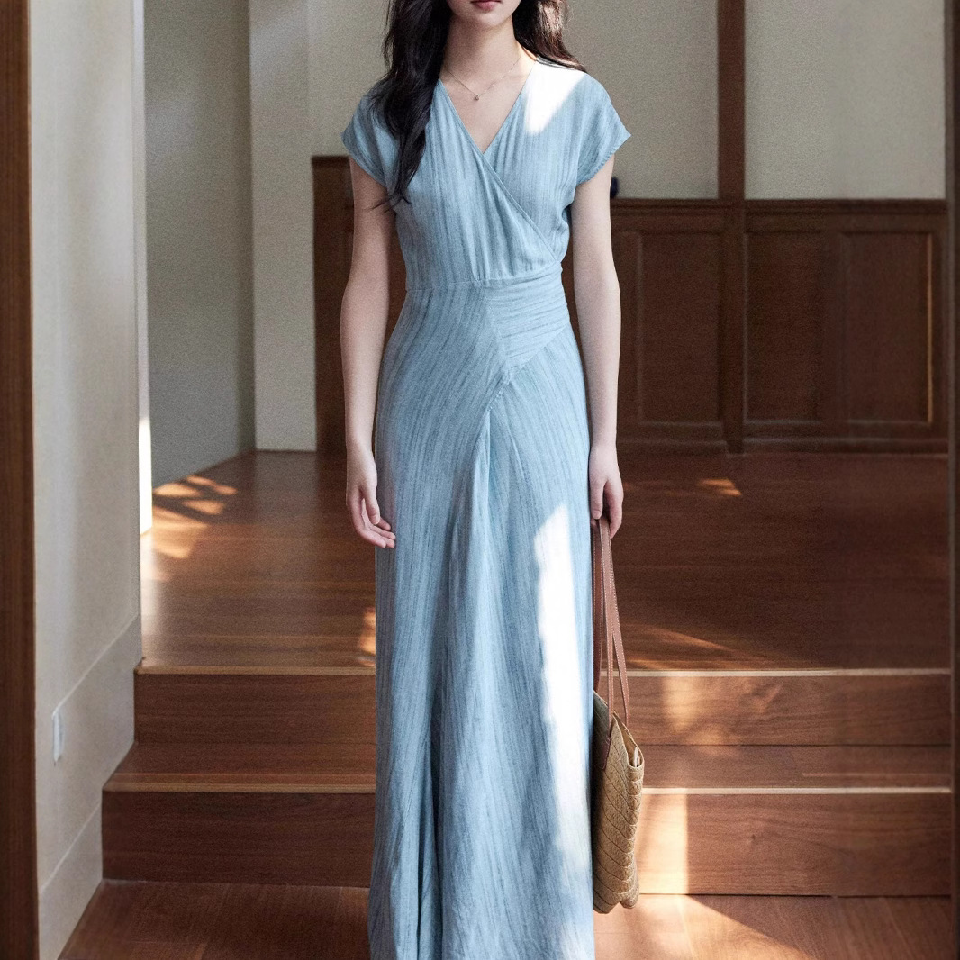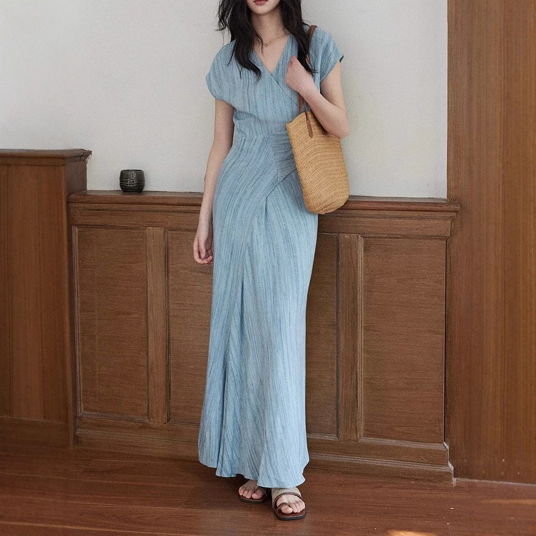 Eryang Design [Jinyan] imitation fried color texture short-sleeved dress for women commuting atmospheric and simple temperament long skirt