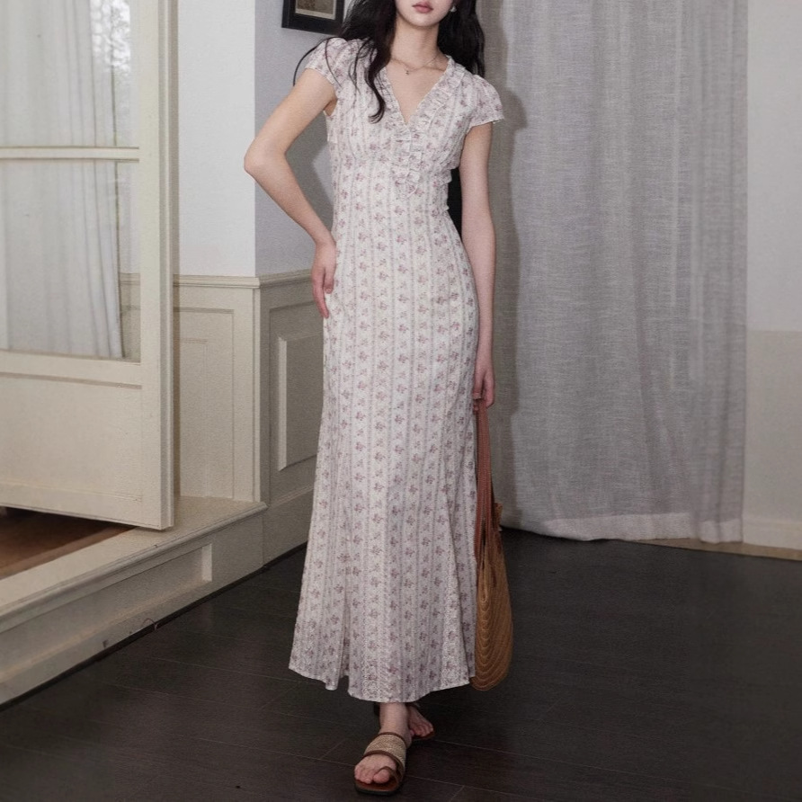 Eryang Design [Lezhi] Retro neck embroidered floral dress with female temperament high-end slim French long skirt