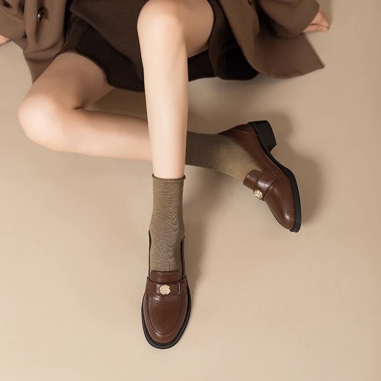 French retro British style thick heel shoes for women with soft leather camellia leather shoes spring and autumn single shoes mid-heel