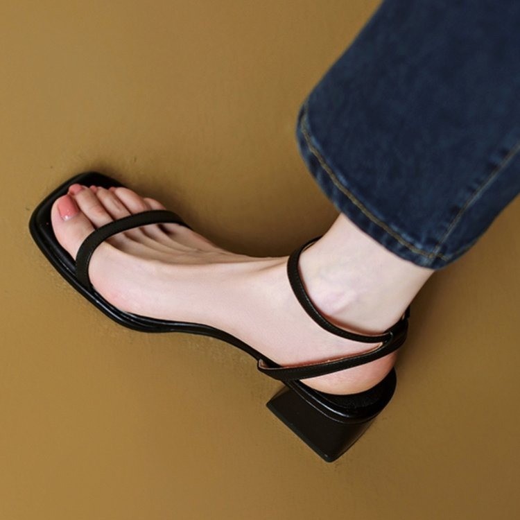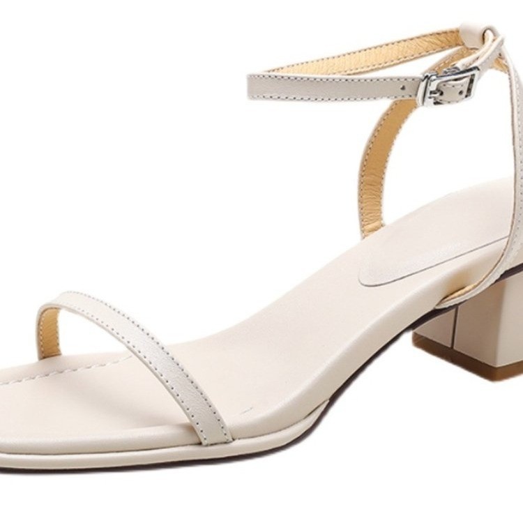 French summer soft leather retro mid-heel simple open toe square toe thick heel fairy sandals for women