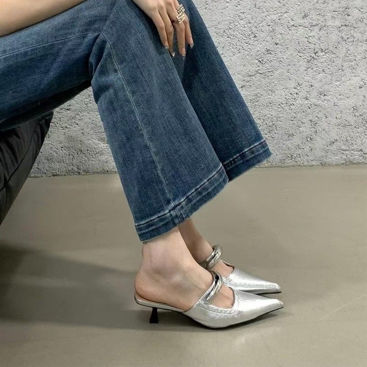 French temperament leopard print pointed high heels for women in spring and summer fairy kitten heels Baotou half slippers