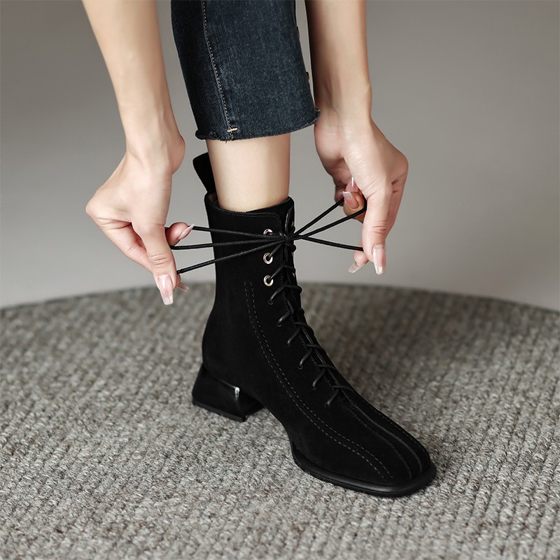Green lace-up short boots for women with thick heel soft leather matte autumn and winter fashion retro simple square toe mid-heel Martin boots