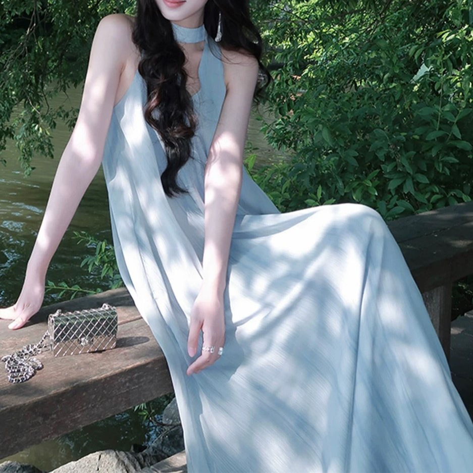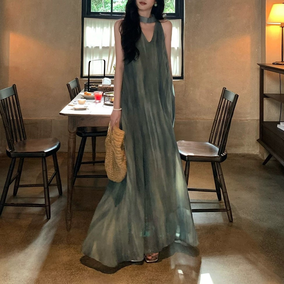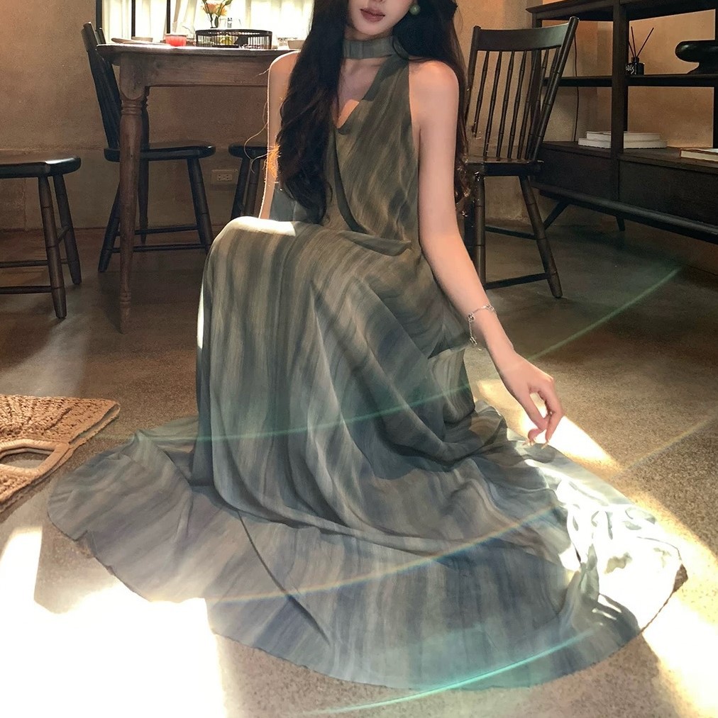 High-end style vacation style tulle neck halter dress for women’s summer vest long skirt