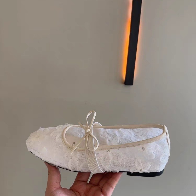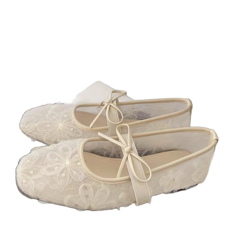 Lace mesh ballet style light mouth single shoes for women summer bow one-liner Mary Jane women’s shoes