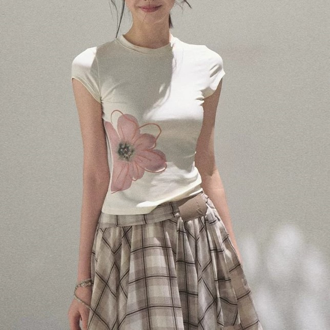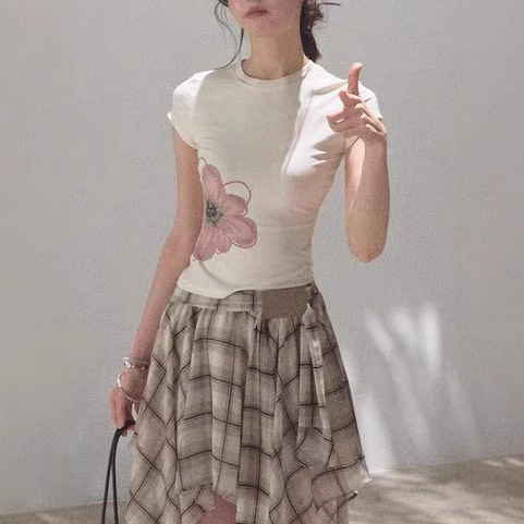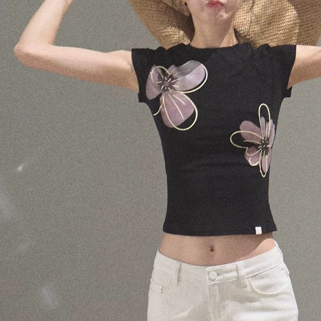 Original artistic smudge mesh niche spliced one-shoulder shirt women’s top