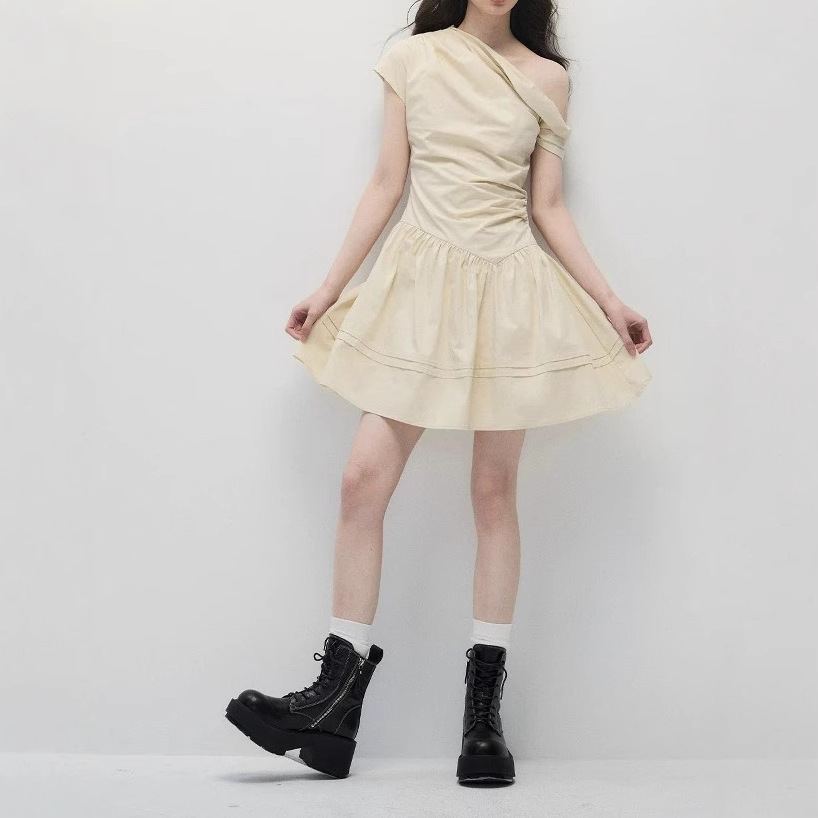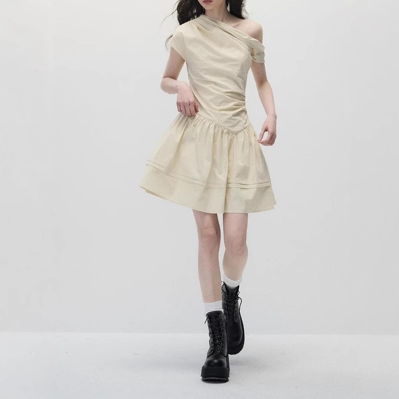Original summer design and temperament, waist-hugging and slimming shoulder-shaped beige dress for women
