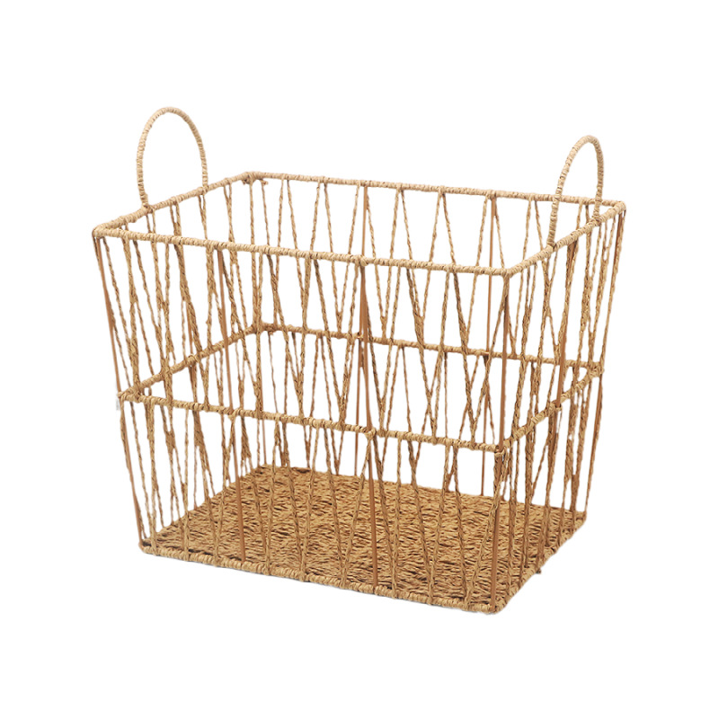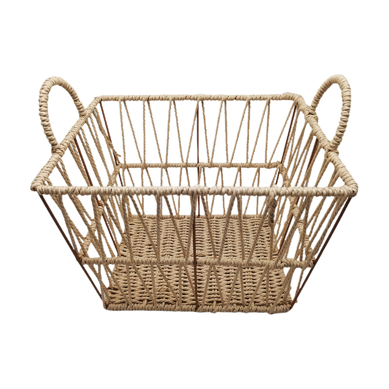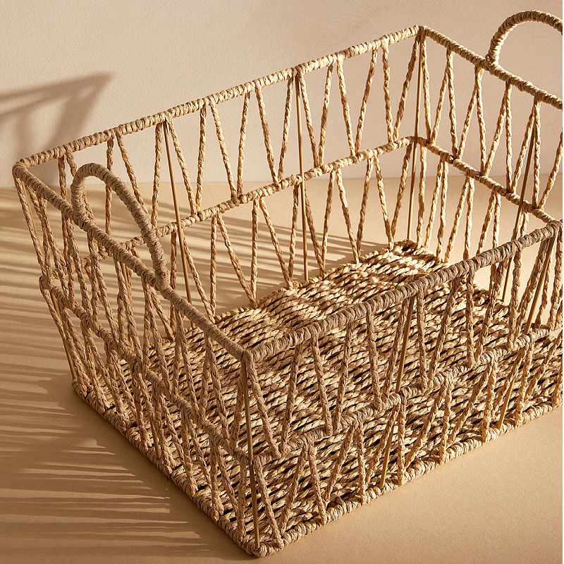 Paper rope rattan bathroom towel clothes toy storage frame with handle fashionable hollow storage basket