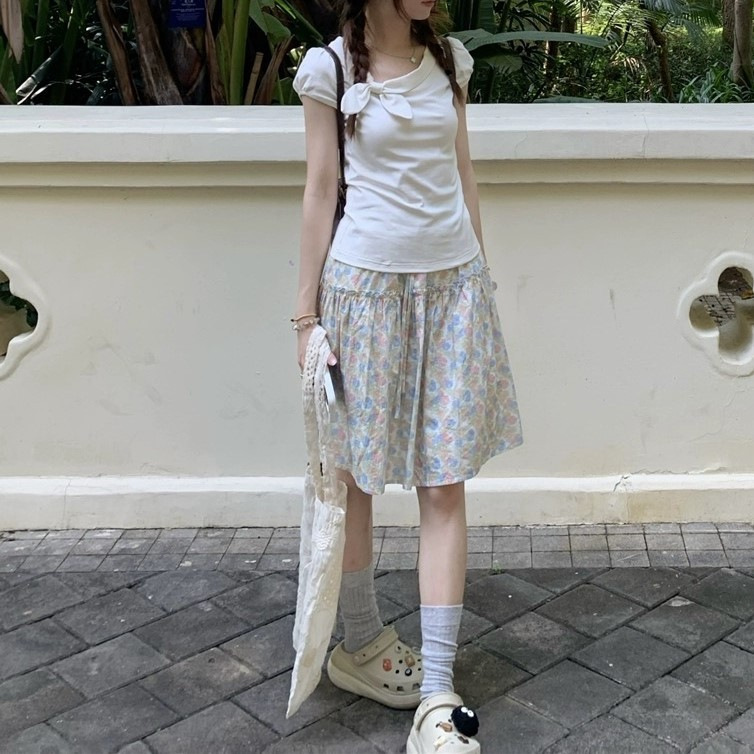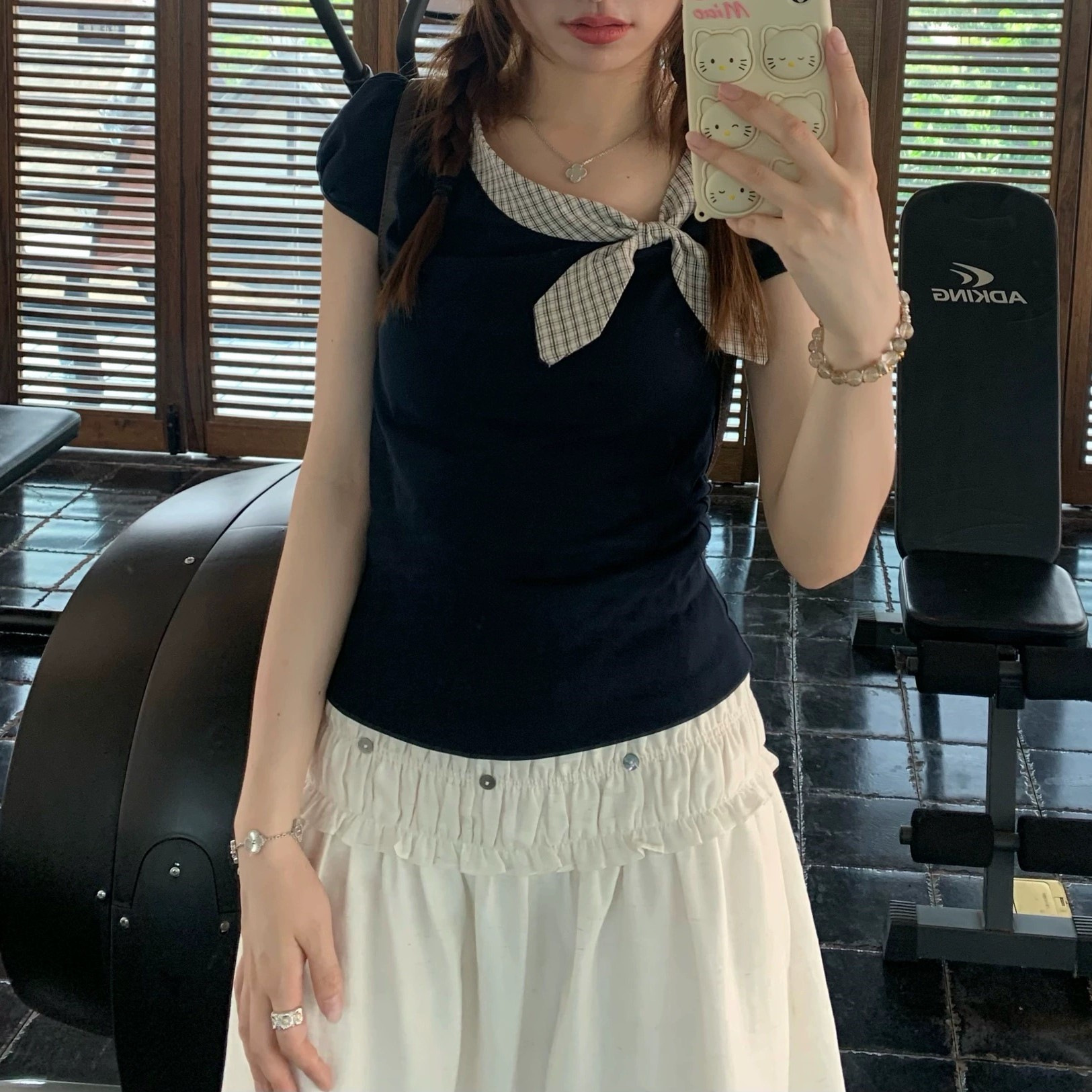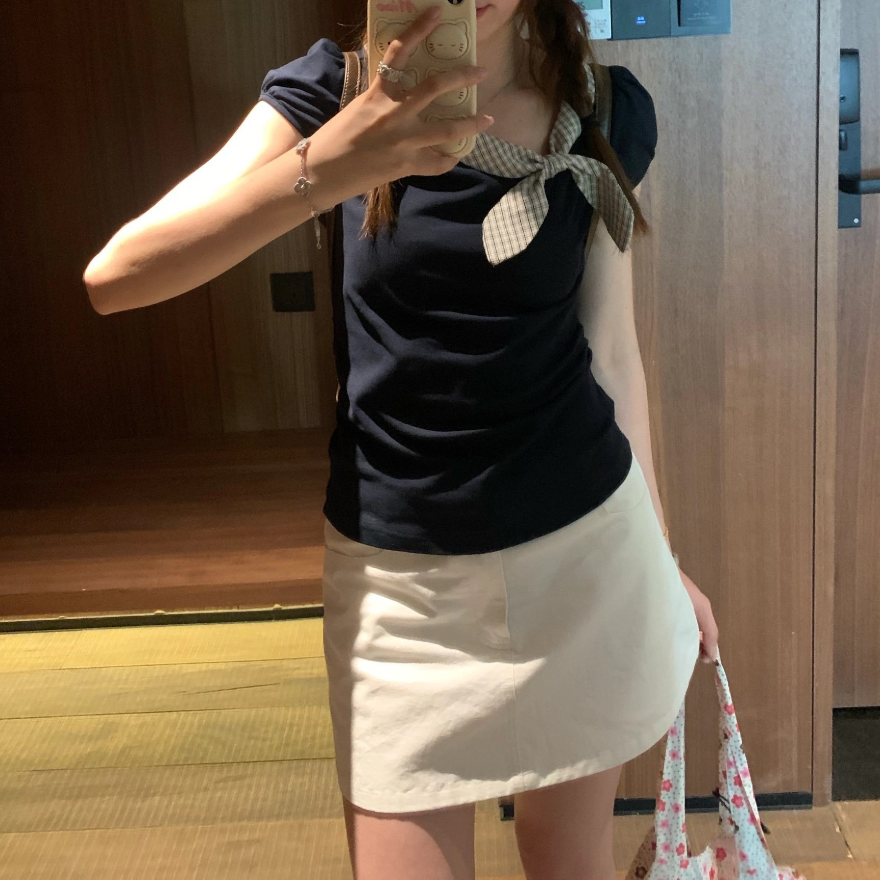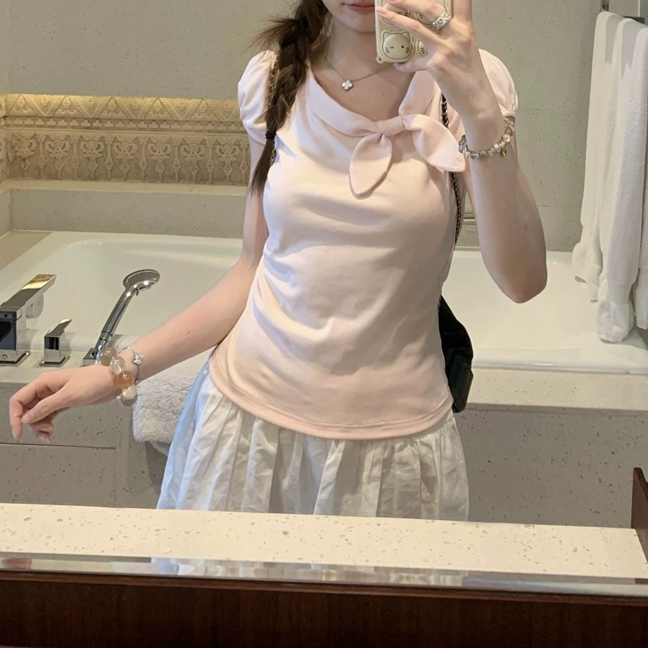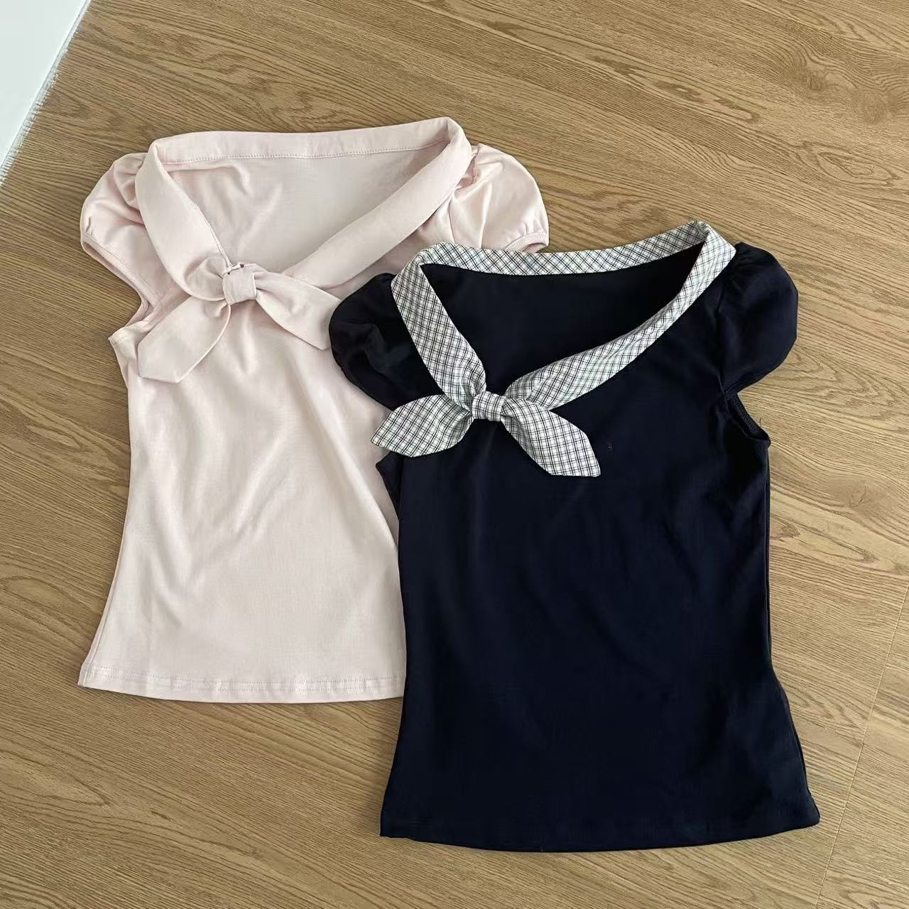 Rabbit ears well-behaved short-sleeved shirt three-color summer slim shoulder top makes you look thin