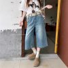 Real-life photo of loose and slimming water washing blue-padded floor jeans for women casual and versatile wide-leg pants