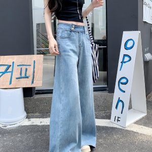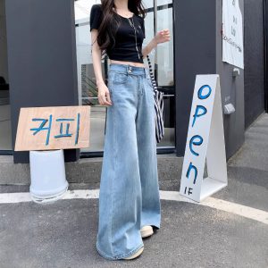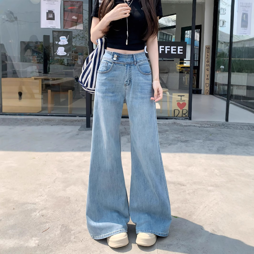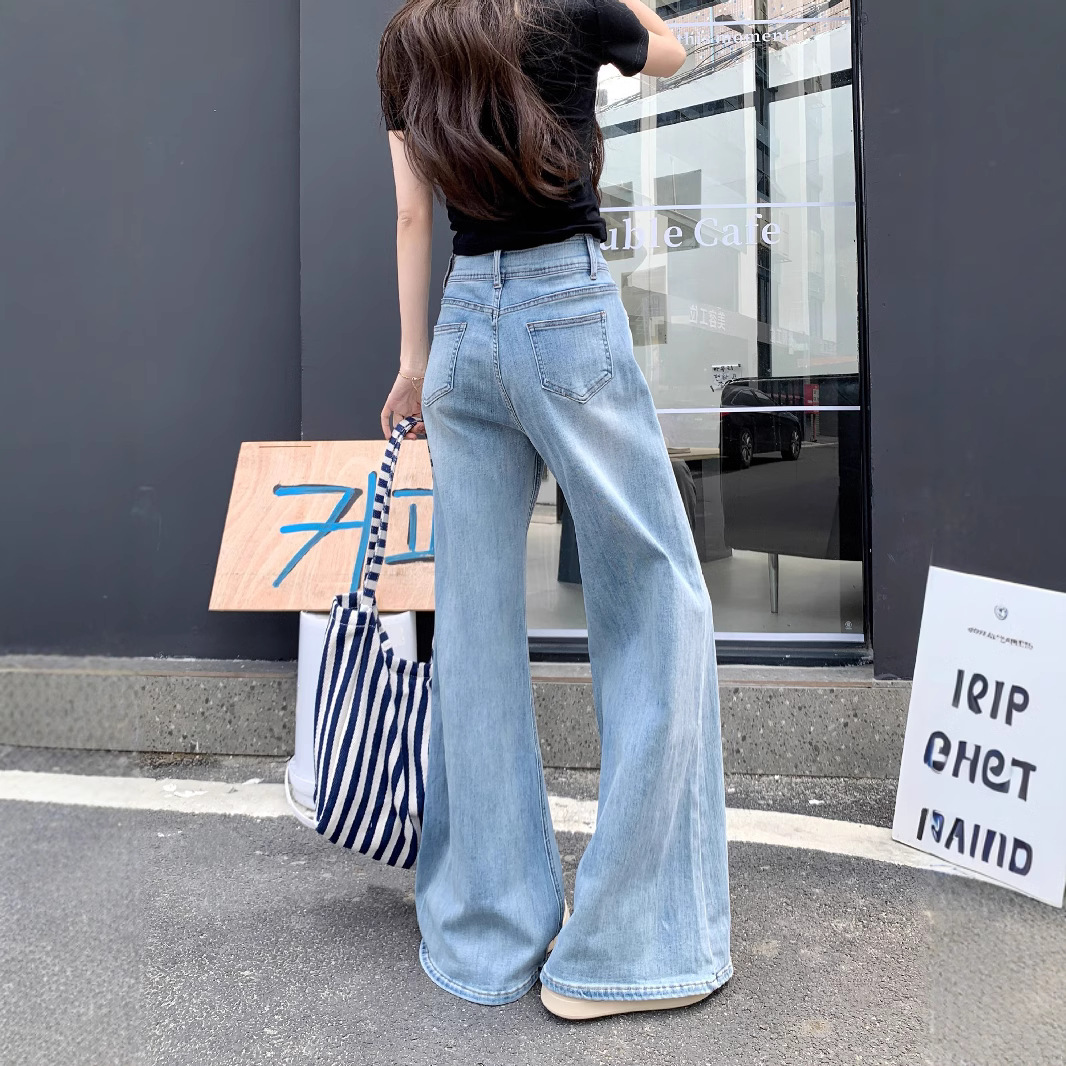 Real-life photo of spring and summer loose and slightly flared elastic jeans for women with high waist wide-leg pants