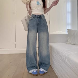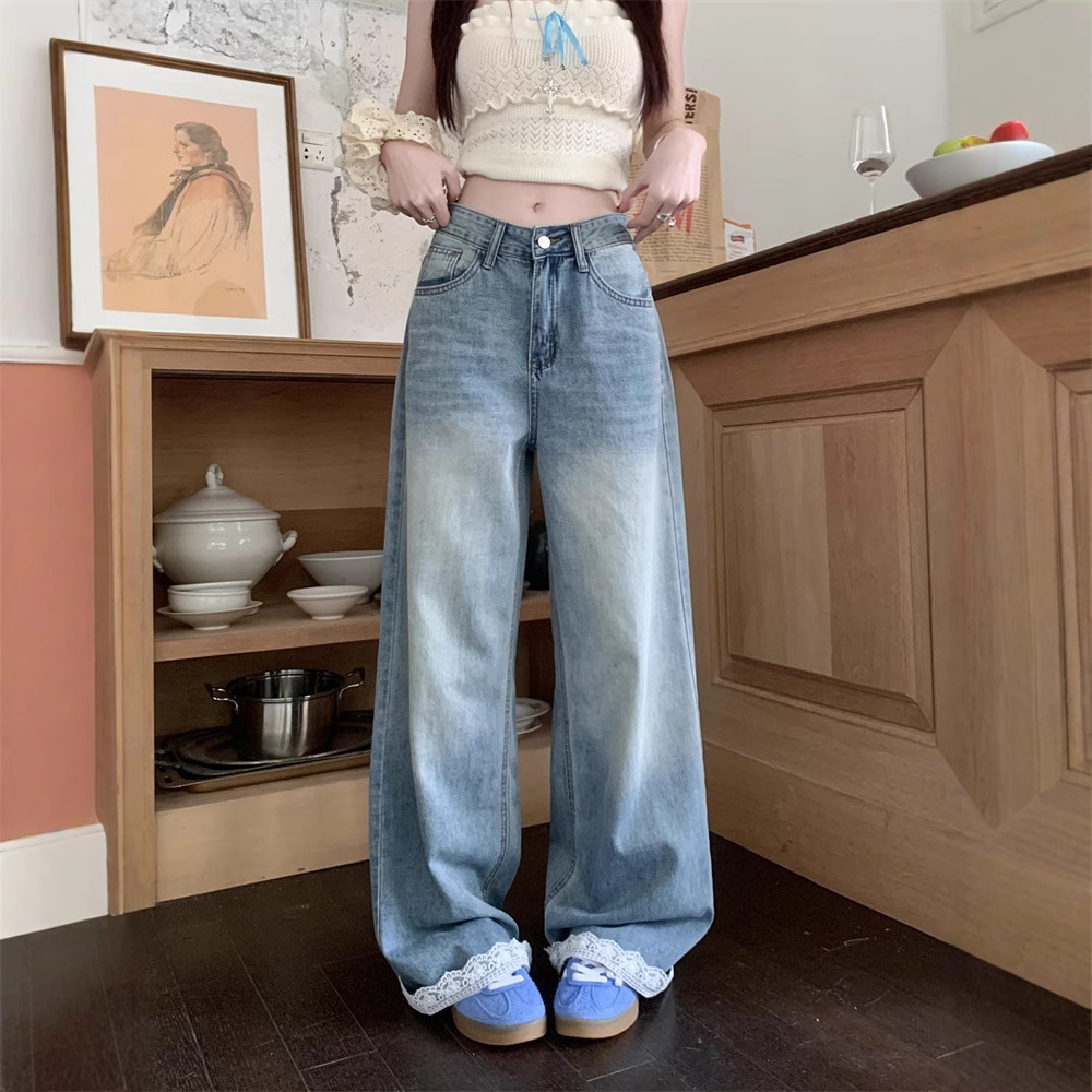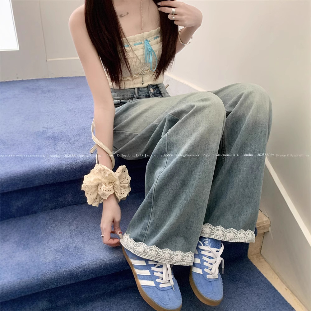 Real photo American retro lace splicing design wide-leg jeans women’s high waist slim floor trousers spring