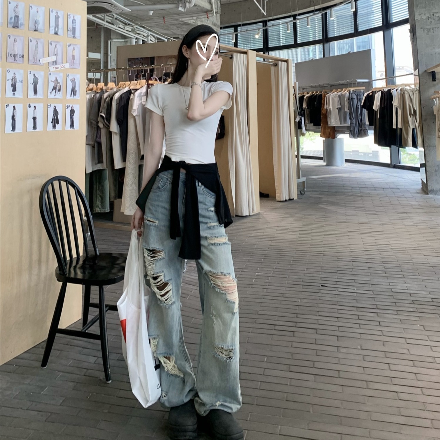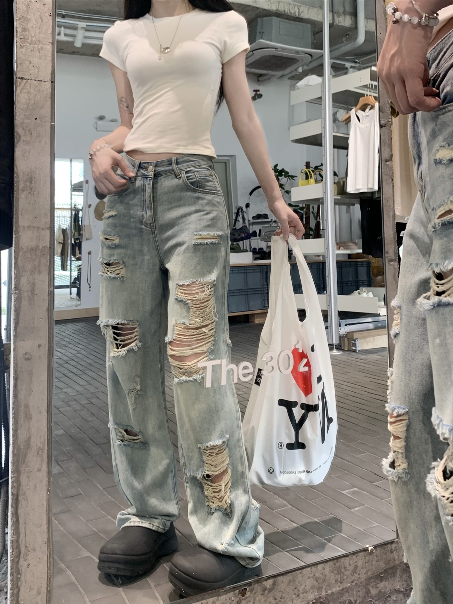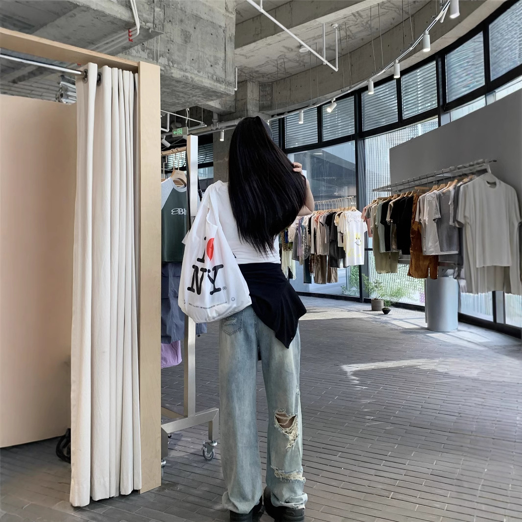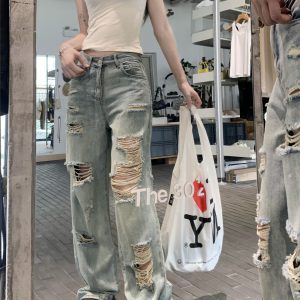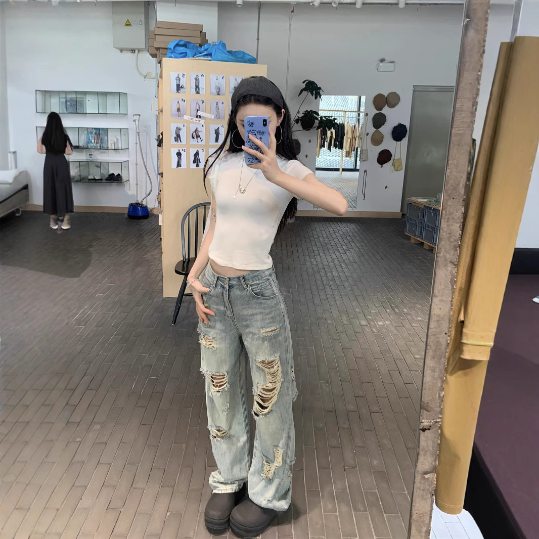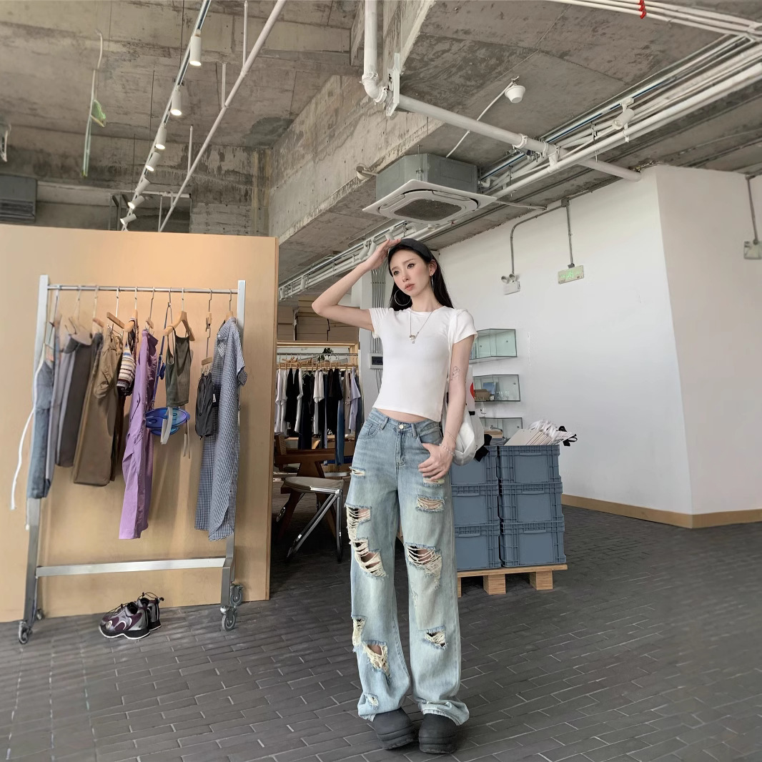 Real photo of American street blue ripped washing jeans for women in spring and summer high waist loose slimming wide-leg pants
