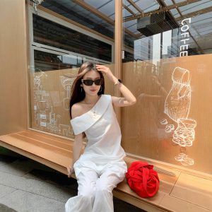 Real photos of summer casual, versatile and fashionable niche design, off-shoulder sleeveless top and pants set