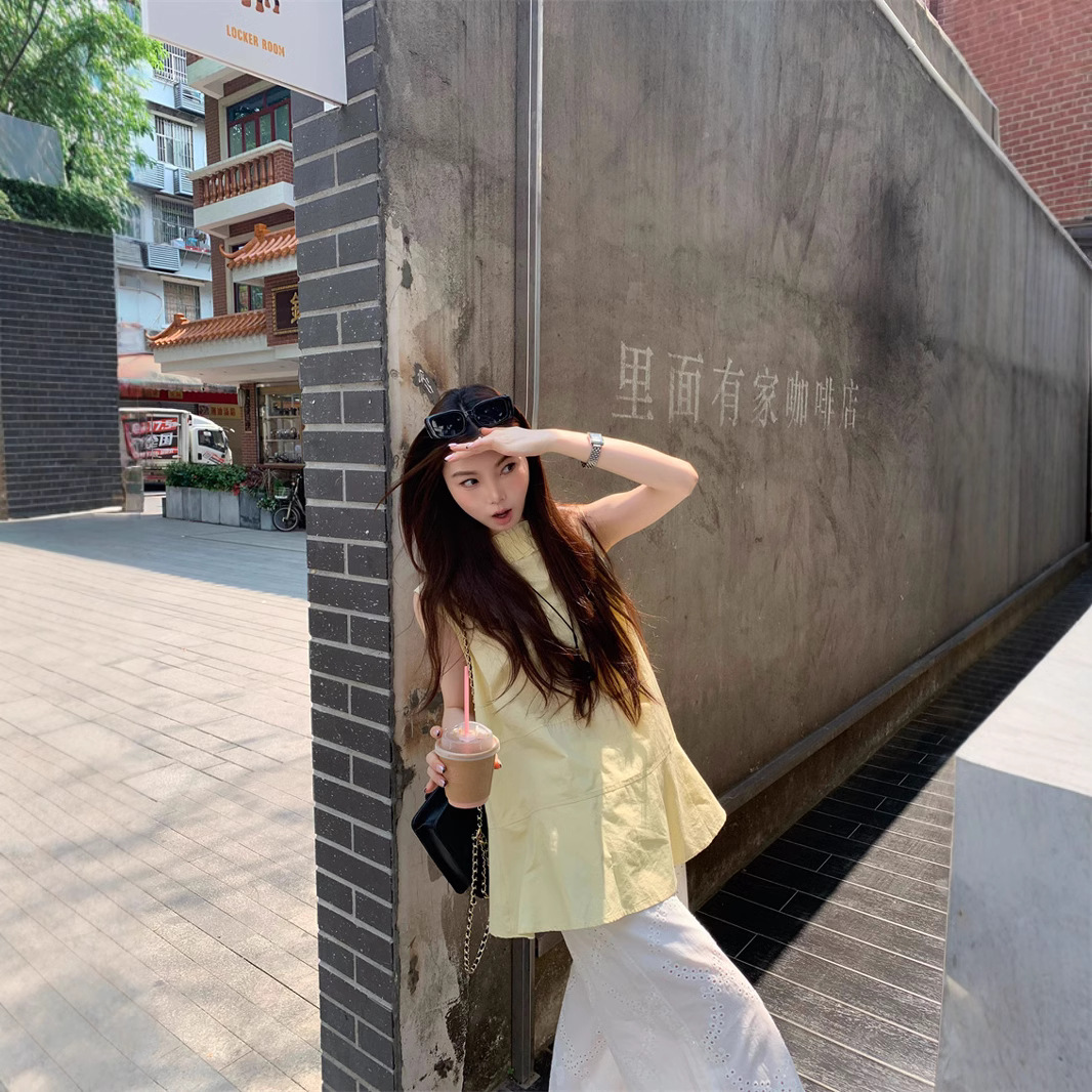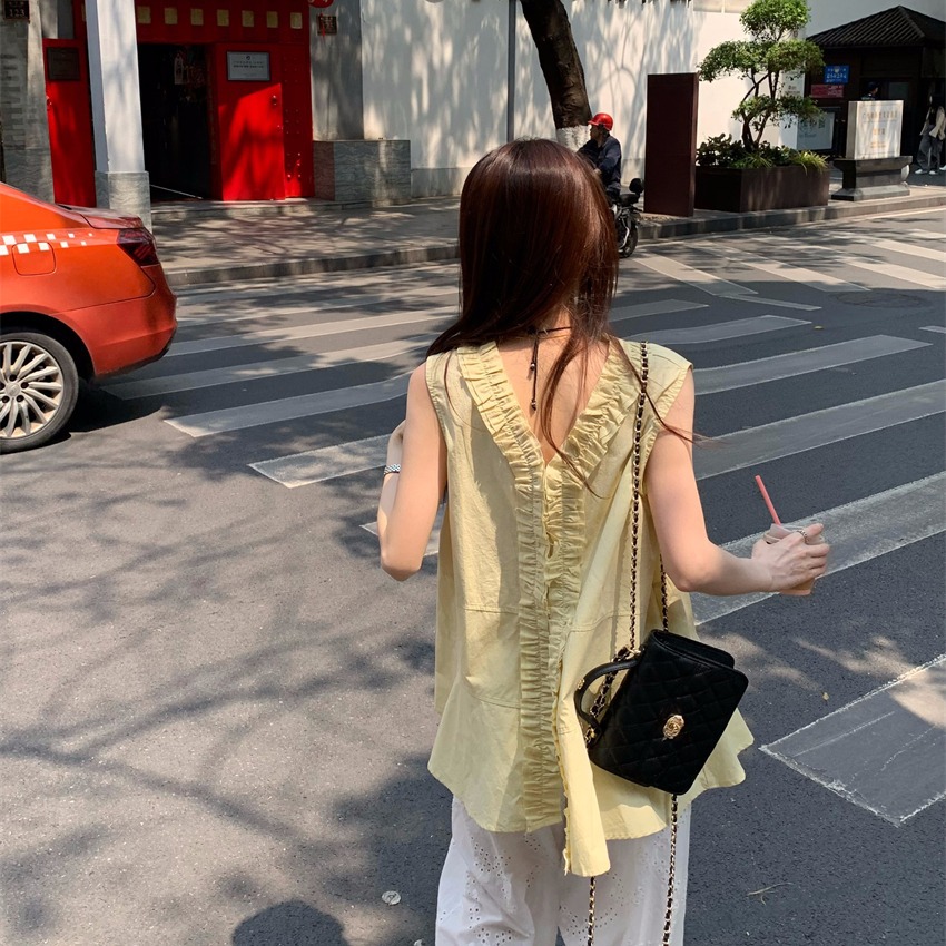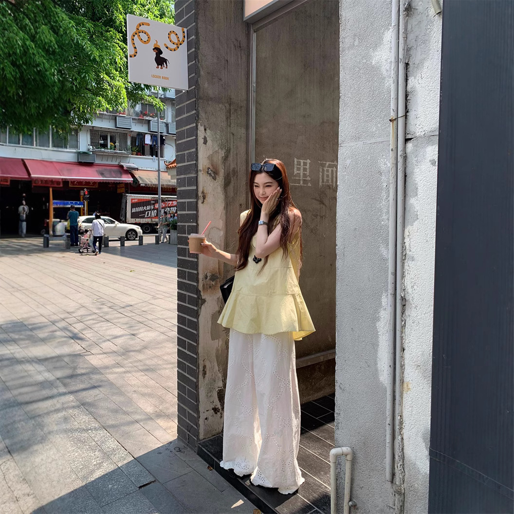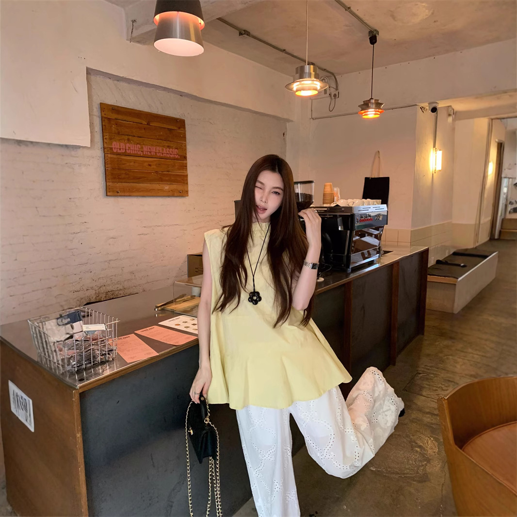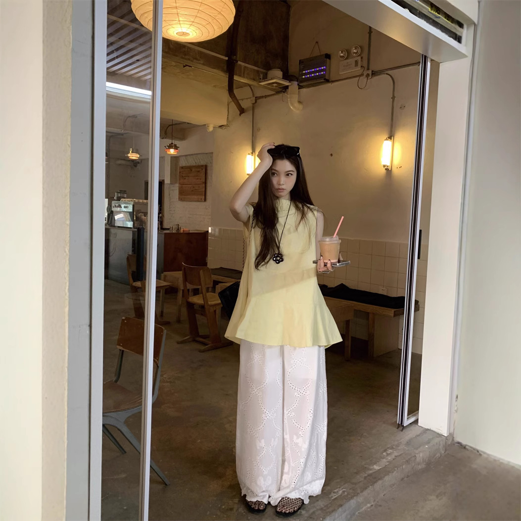 Real shot Korean design sense front and back two-collar shirt versatile lace wide-leg pants suit for women