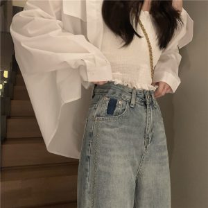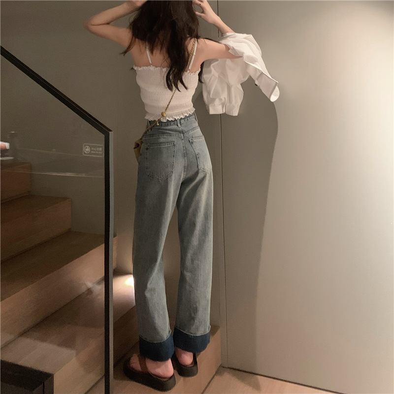 Real shot of blue high-waisted retro loose wide-leg pants for women’s side stitching and rolling versatile jeans