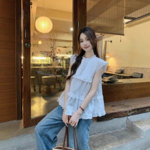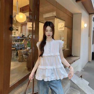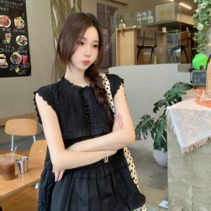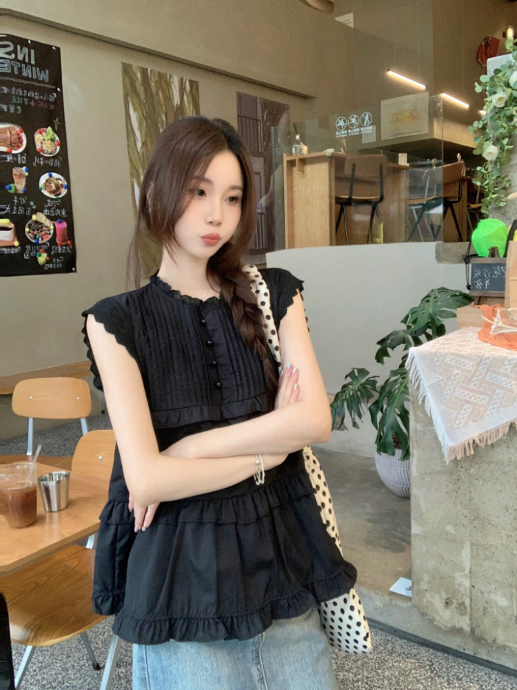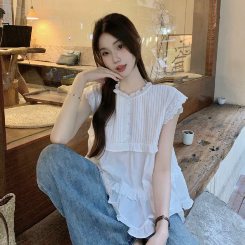 Real shot of Korean sweet age-reducing lace flying sleeve shirt for women with niche pleated top