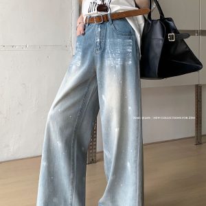 Real shot of summer personalized spray painted denim wide-leg pants for women with high waist design loose trousers
