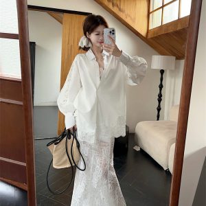 Real shot~Design-sensual lace spliced long-sleeved shirt for women + lace underwear + high-waisted skirt three-piece set