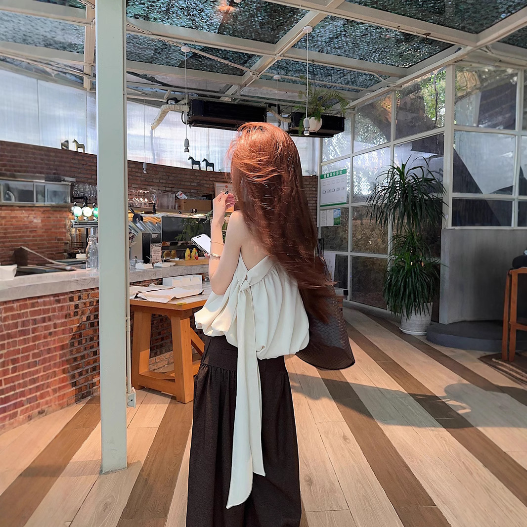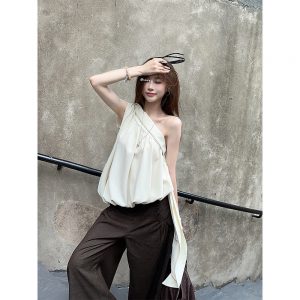 Real shot~French irregular slanted shoulder top for women’s sleeveless outerwear design sense streamer vest suspender summer