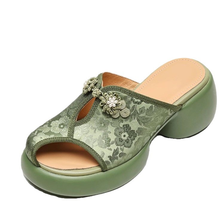 Retro outside wearing thick-soled summer bag-toe half-slippers for women soft leather lazy green sandals thick heel embroidered hollow