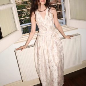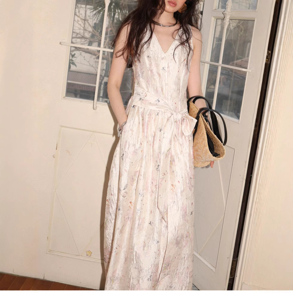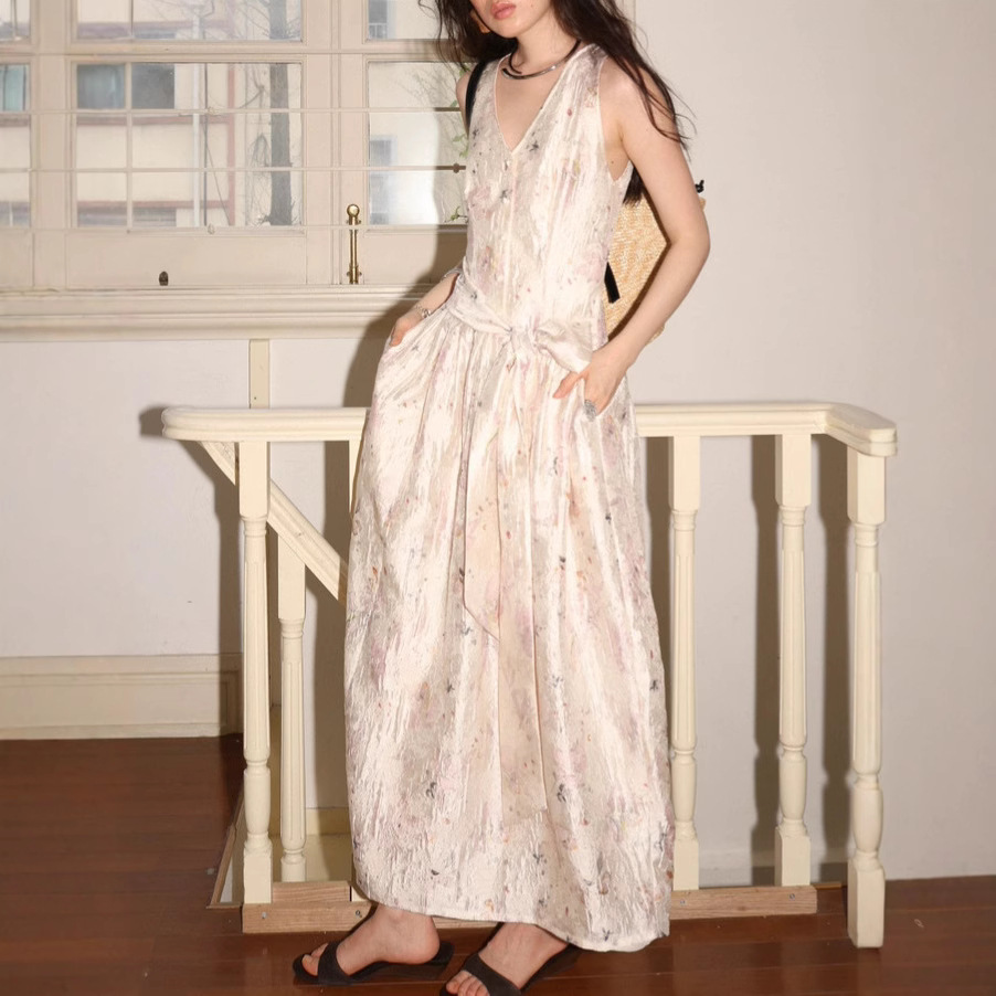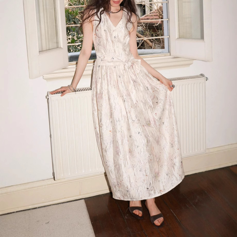 Simple linen wrinkle printed collar tie spring print flower bud dress