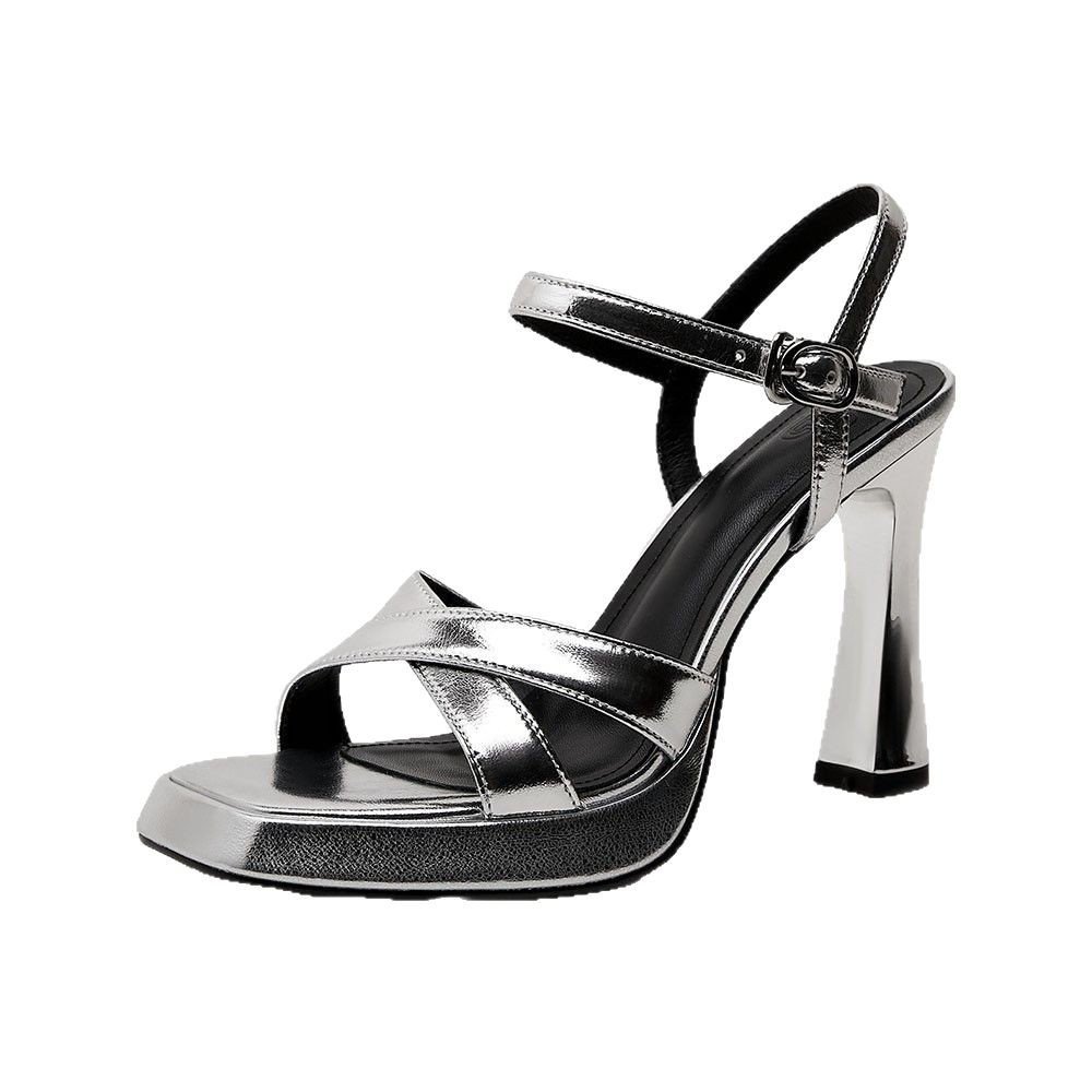 Simple thick heel cross-belt open-toed sandals for women in summer soft leather waterproof platform one-liner simple silver high heels