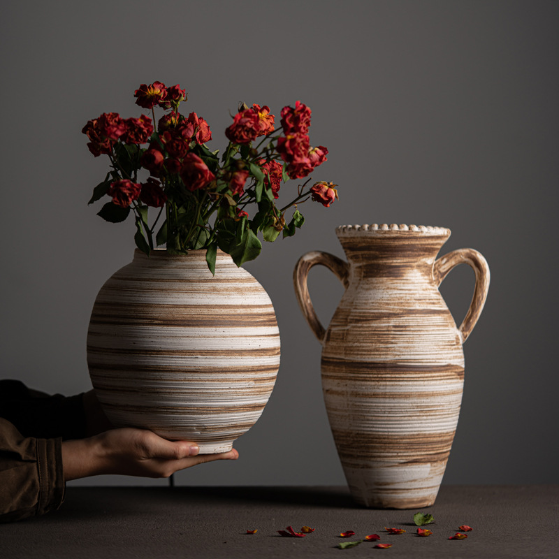 Simple Wasabi style stone pottery double-eared round pattern ceramic vase high-end light luxury home soft decoration ornaments