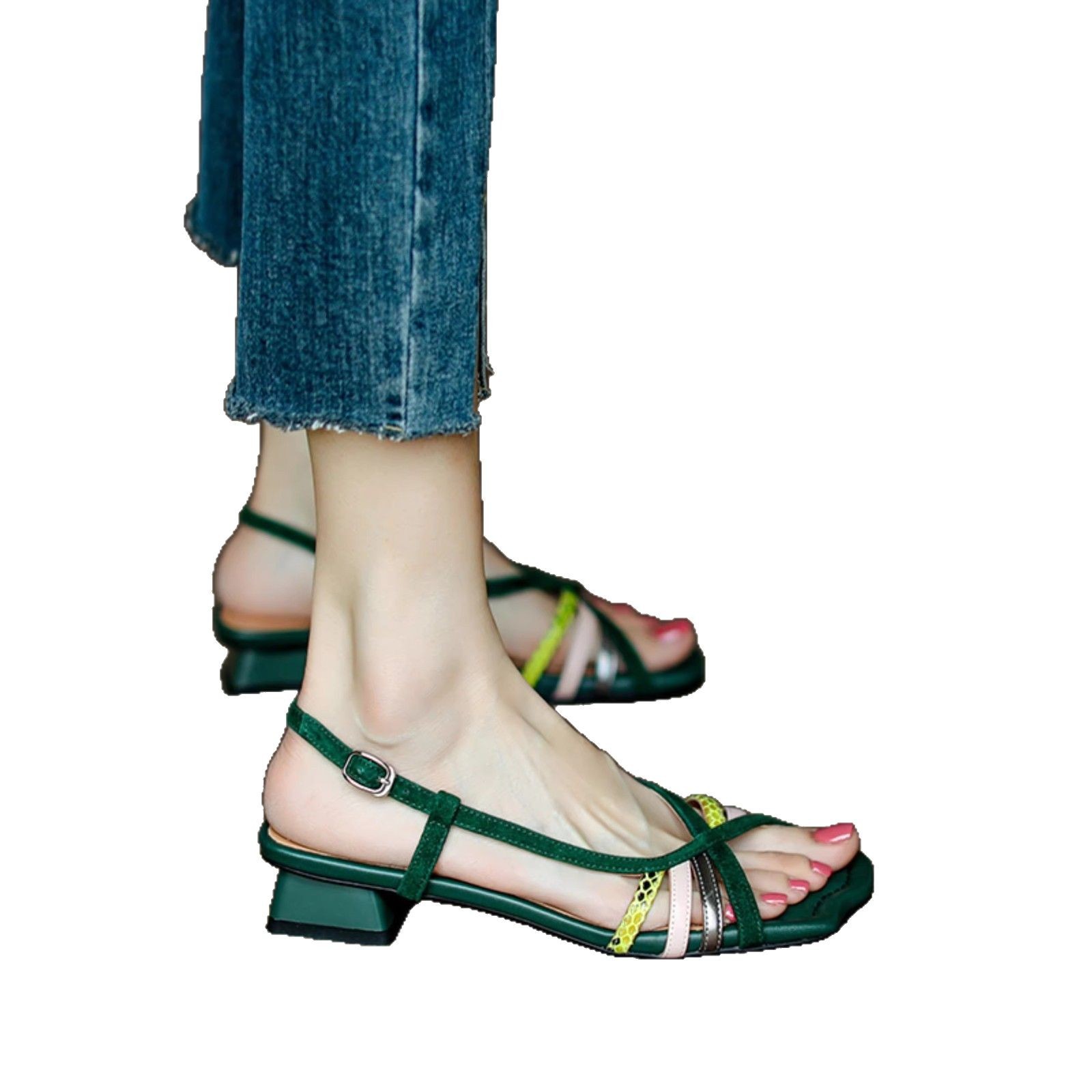 Soft leather version soft leather hand-woven color-blocking fish mouth sandals for women French retro summer low heel thick heel