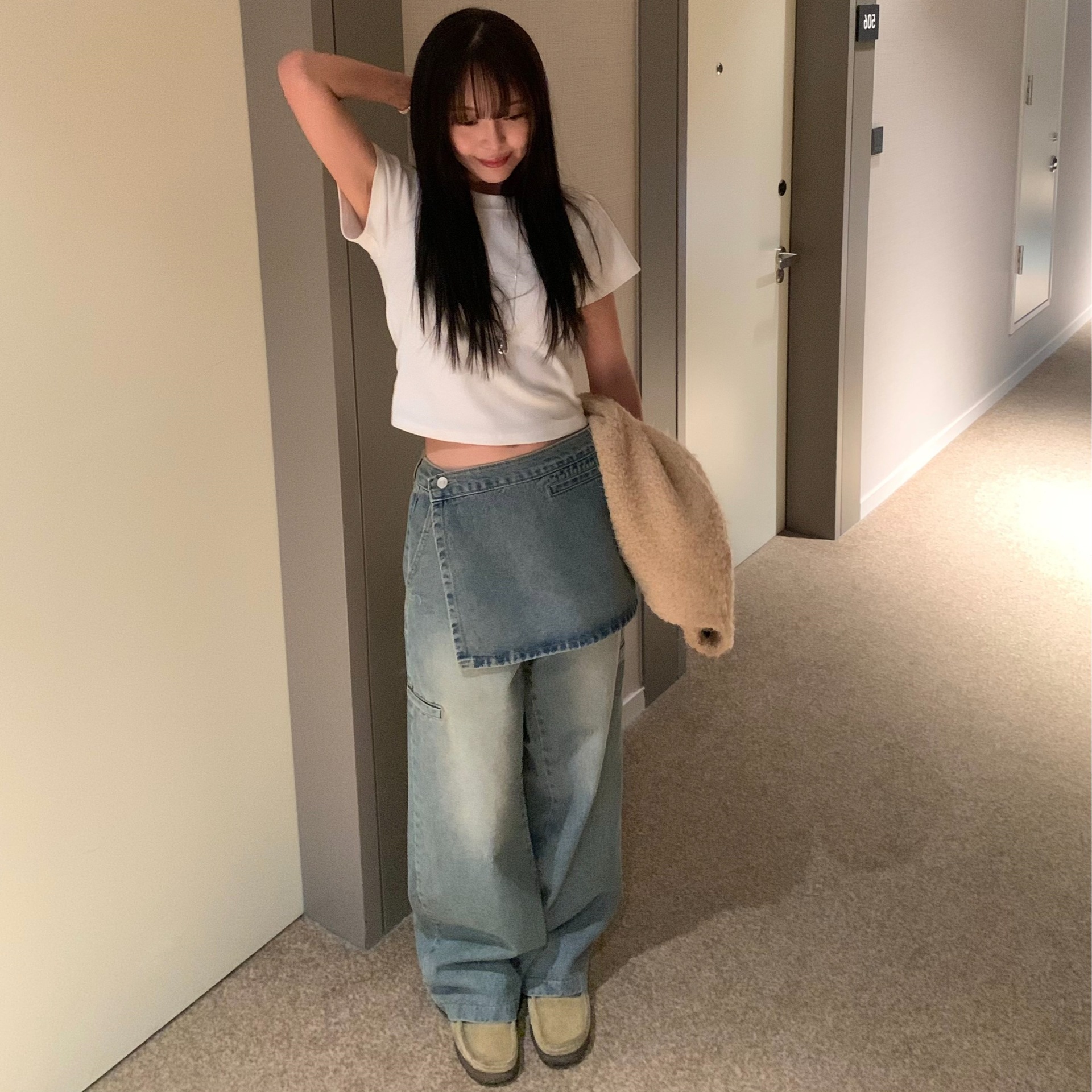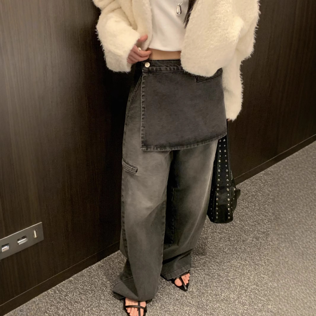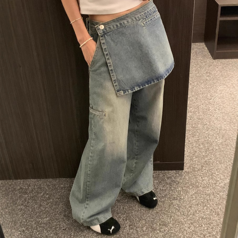 Spring fashionable butt curtain removable two-piece set retro pocket design Korean style versatile jeans for women