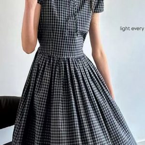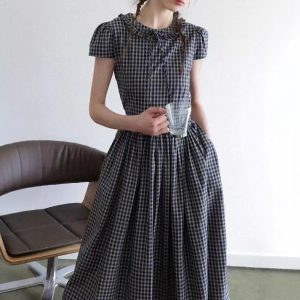 Summer Symphony’ retro plaid decorative earrings micropuff sleeves high waist big skirt dress for women