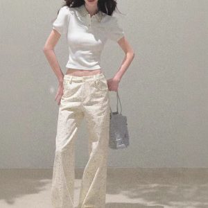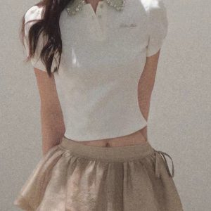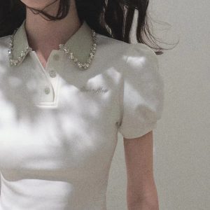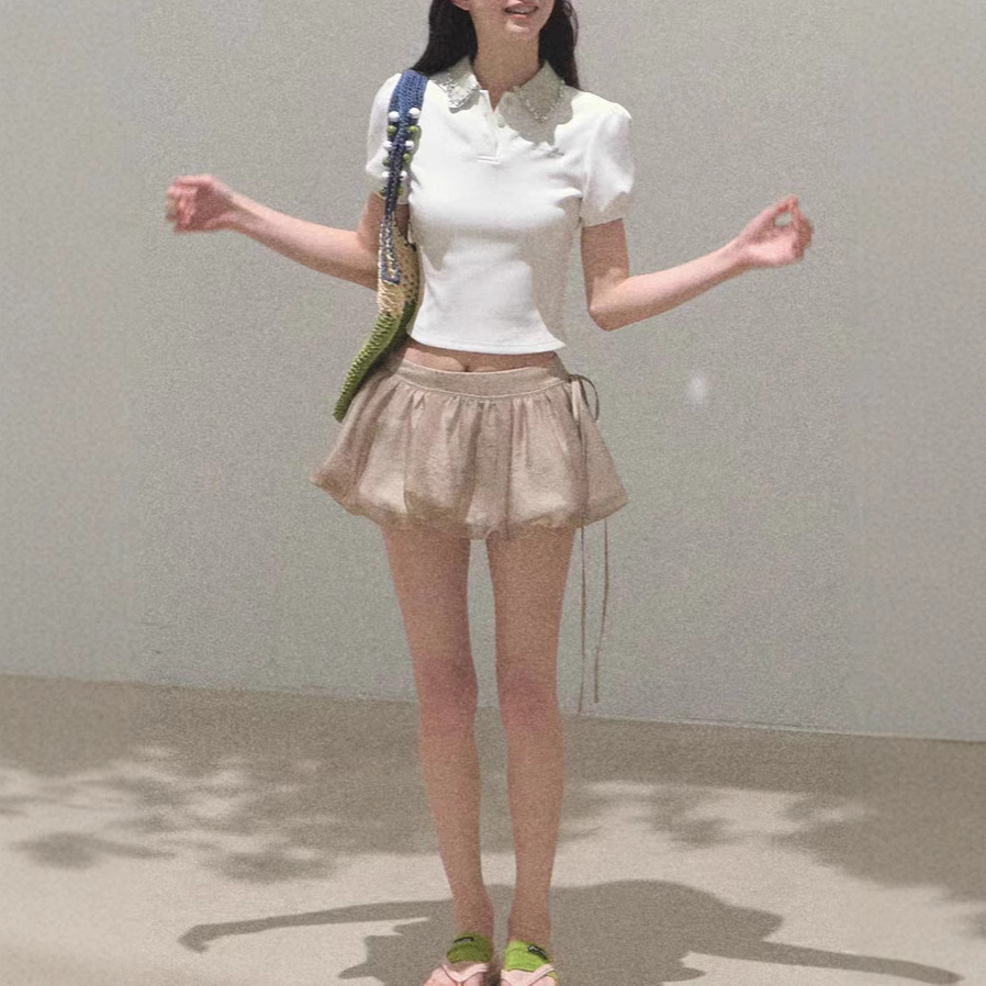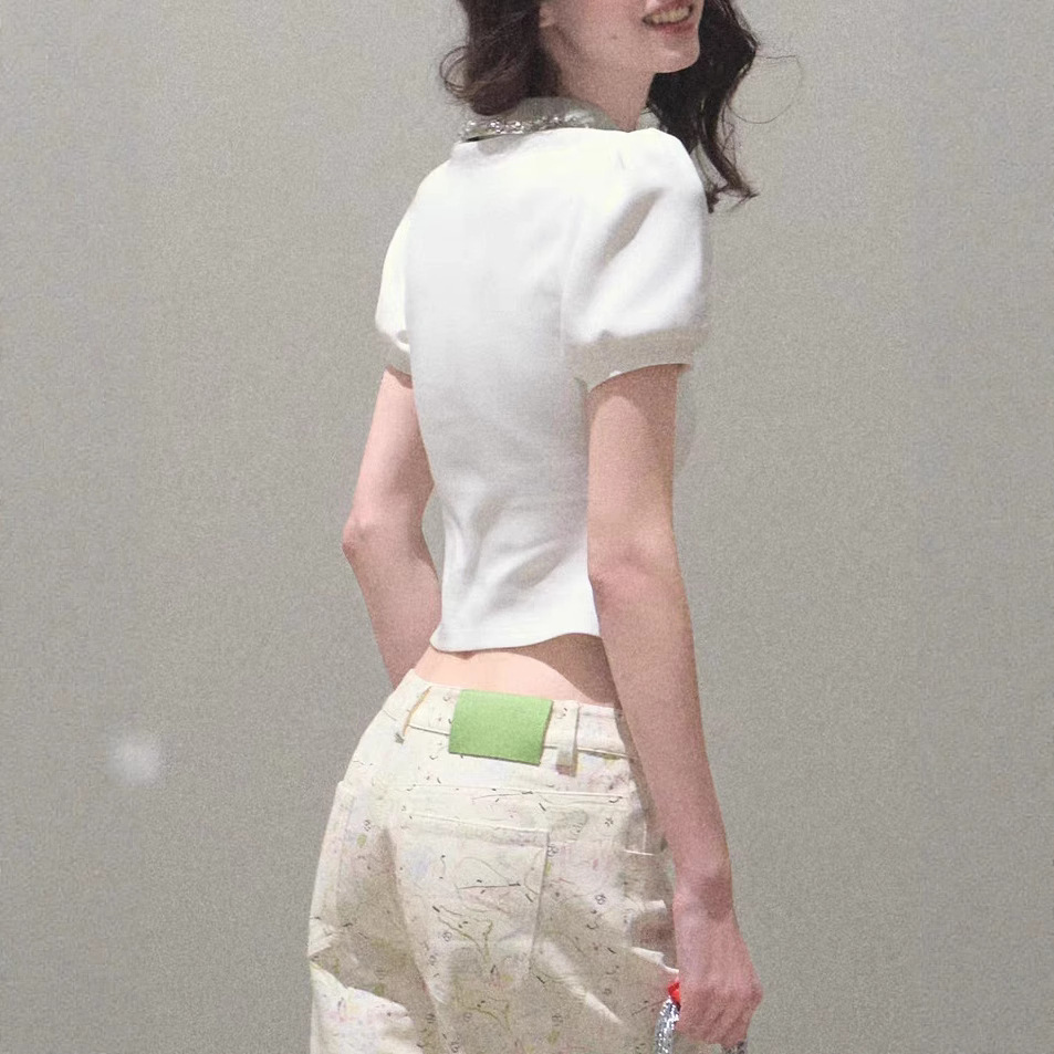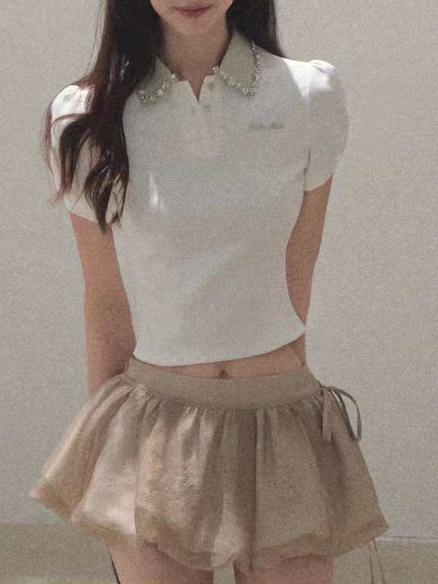 / “Sunset to the sun” New color broken diamond waist-closed collar short-sleeved shirt stretch-piece top