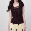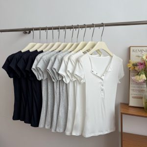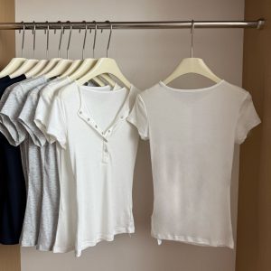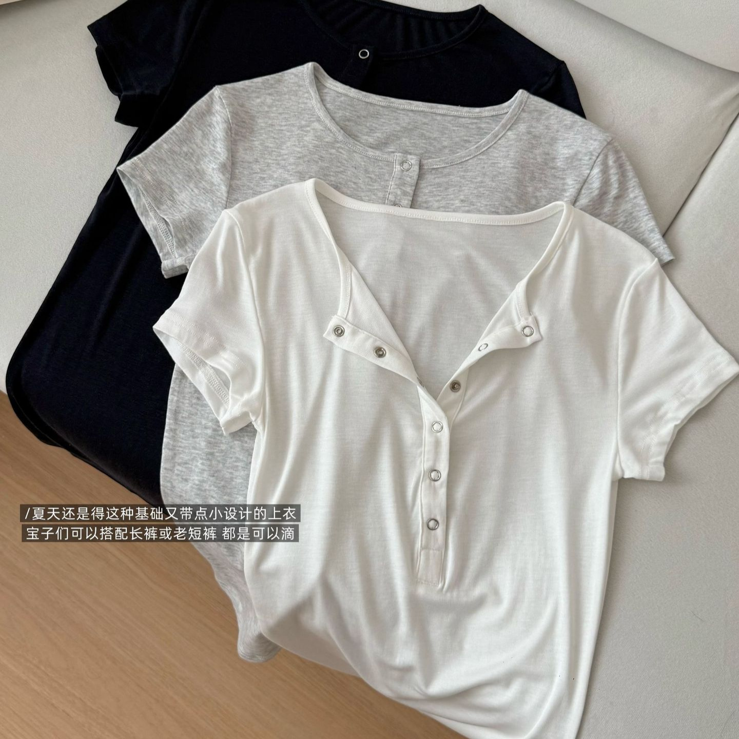 Tennis solid color Henry collar button design shirt for women in summer waist-hugging temperament front shoulder short-sleeved top