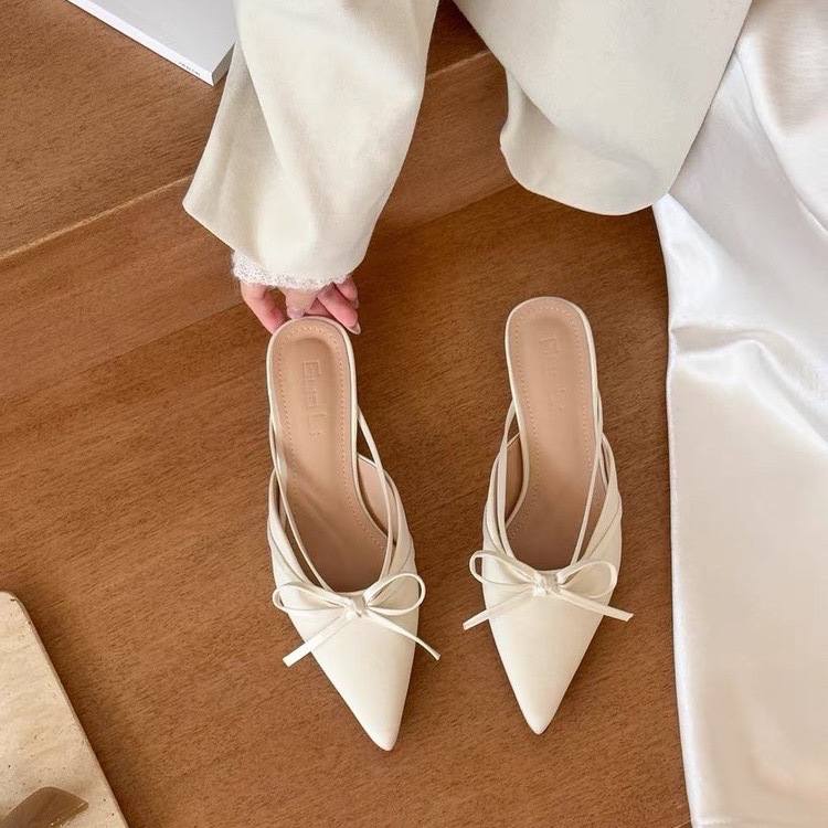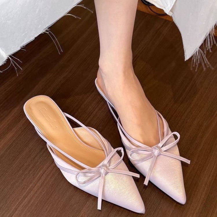 Thick heel bow bag half slipper fairy shoes spring and summer satin French temperament half-scroll single shoes
