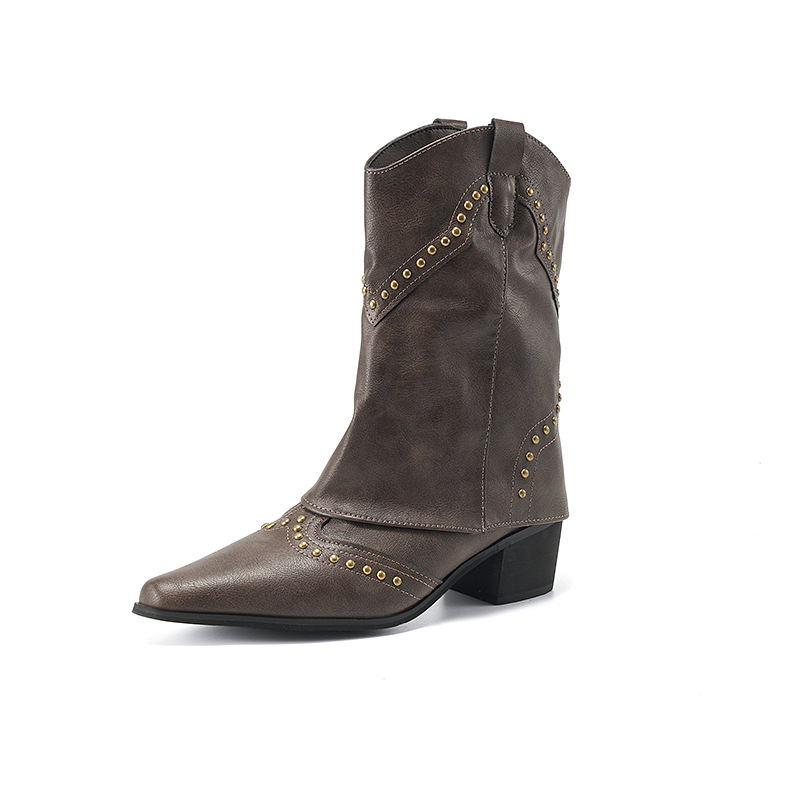 Western denim short boots thick heel mid high heel rivet fashionable pointed toe short boots simple trouser boots women’s shoes